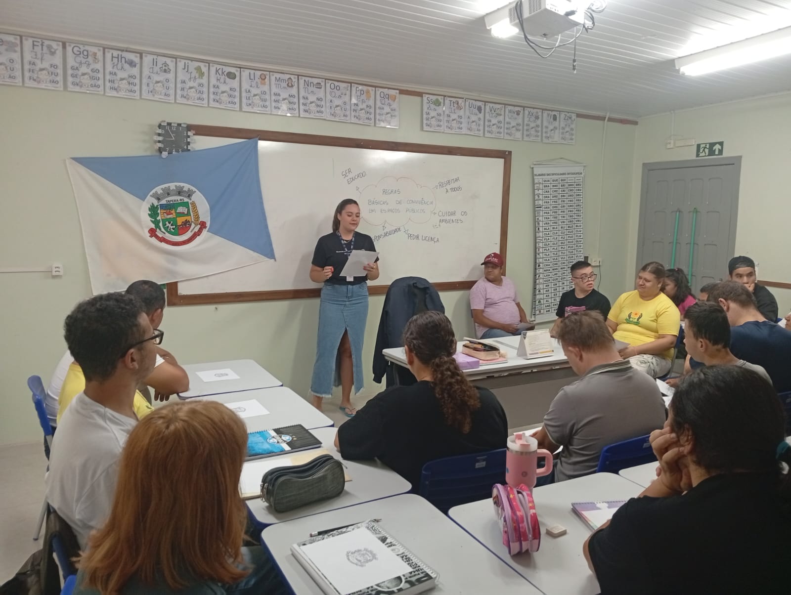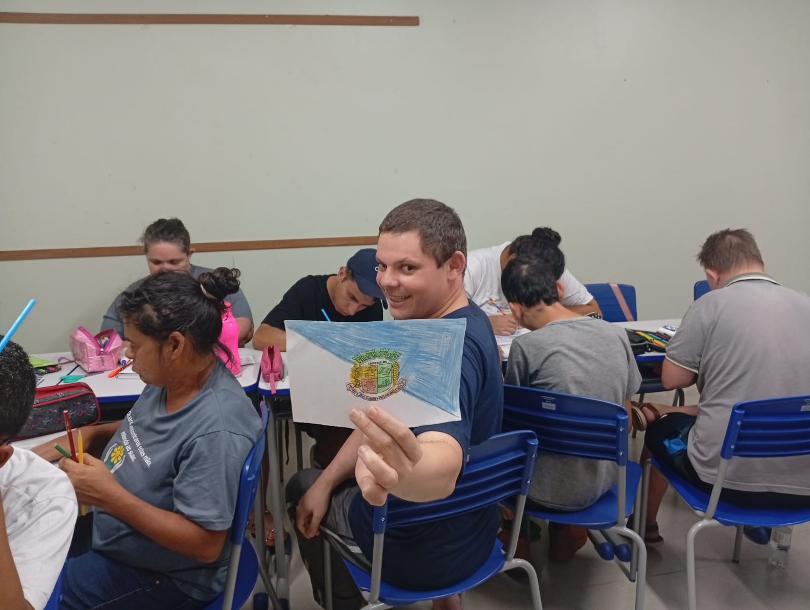 Os alunos das turmas de EJA 1 e EJA 2 participaram de um momento de conversa e aprendizado, mediado pelas professoras Elizângela e Maria Luiza. Durante a explanação, conheceram a origem do município, sua trajetória histórica e a importância de seus símbolos oficiais. Também foi apresentada a bandeira de Tapera, com a explicação sobre o significado do brasão, seus elementos, cores e simbolismos.